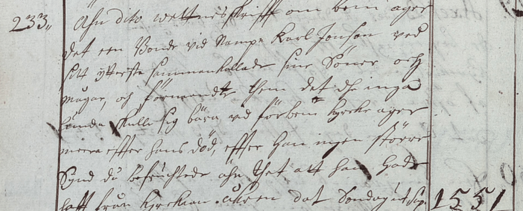 ähr dito wettnesskrift om ben. ägor det en Bonde vid nampn Karl Jonsson ved sitt yttersta sammankallade sina söner och mågar, och förmandte them det dhe inga lunda skulle sig böra vid förbemlte kyrko ägor meera effter hans död, effter han inga större synd då befruchtade ähn thet att han hade haft från kyrckan åkern dat söndag ut Sup 1551