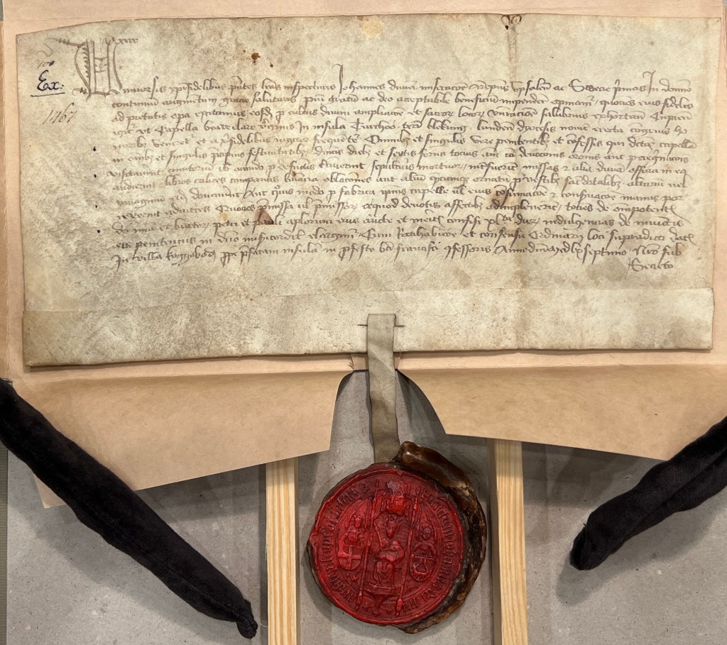 Ture Turesson Bielke grundade ett franciskanerkloster, Sankta Clara på ön Torkö och skänkte det senare med ett kapell till Franciskanerorden. Pergament från 1467 och 1485 fotade jag sist i Köpenhamn. Nedan visas det från 1467.