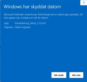 Det öppnar sig då ytterligare en knapp till vänster ”Kör ändå”. Välj det så är det strax klart.