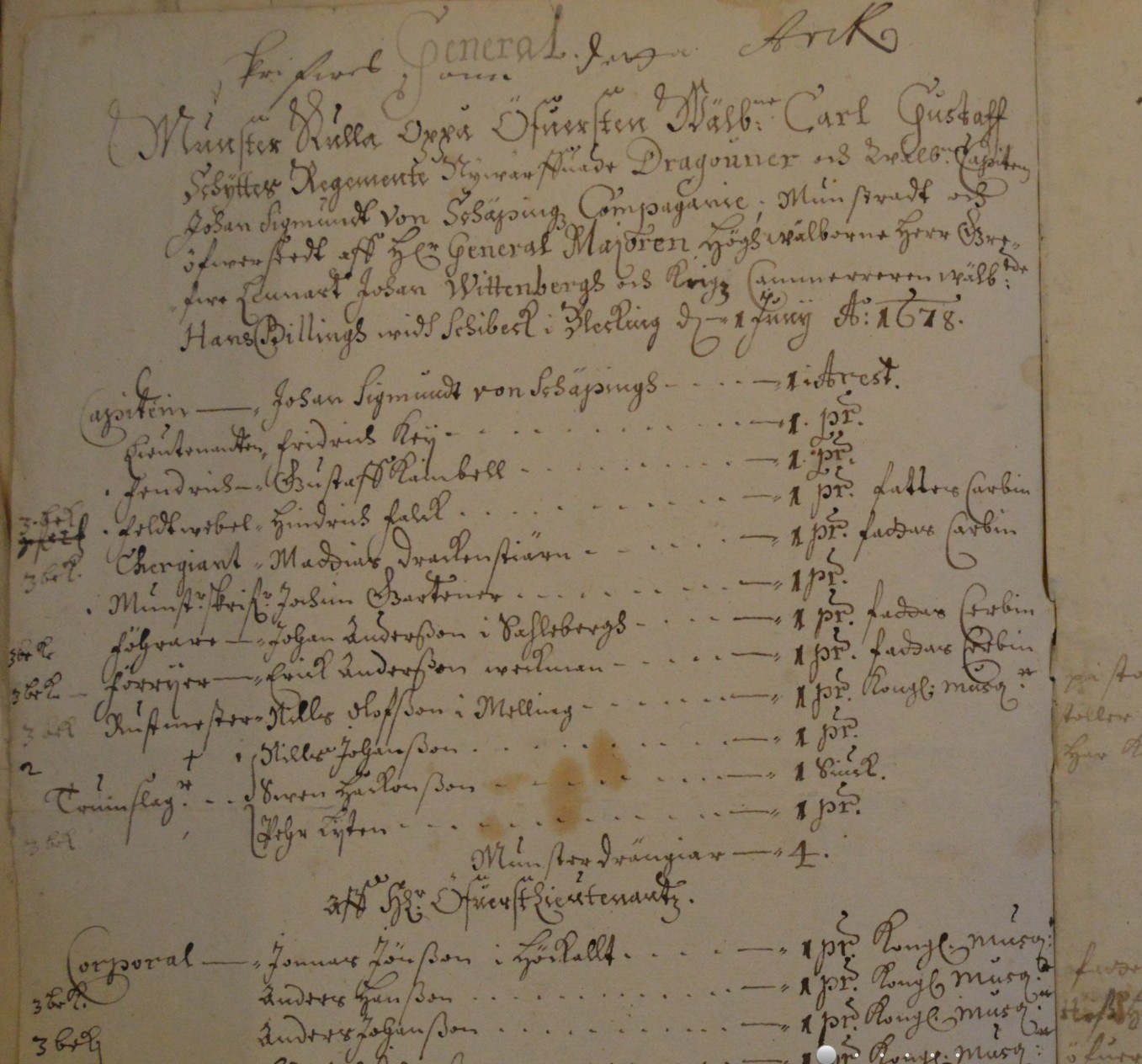 Sedan visar jag ett exempel på en rulla 1678 som finns i Opsnanapede breve i Köpenhamn på ett kompani i Överste Carl Gustaf Skyttes regemente med folk som mönstrats i Blekinge.